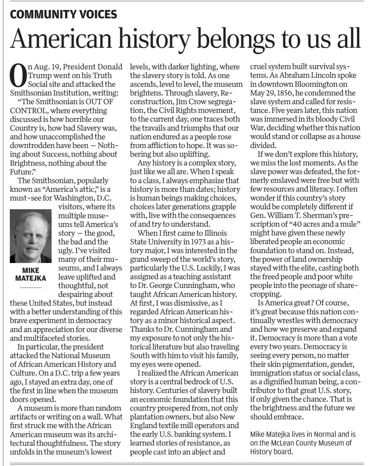 by Mike Matejka, published in the Bloomington IL Pantagraph, September 14, 2025.