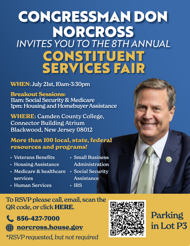 News Congressman Donald Norcross’ 8th Annual Constituent Services Fair Helen Ireland 25 Jun, 2025 Social share icons